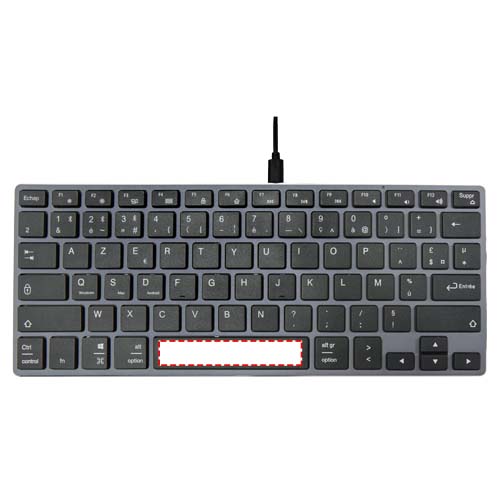 Lätt men ändå hållbart och snyggt tangentbord (AZERTY-layout med 78 tangenter) med aluminiumhölje. Tangentbordet har Bluetooth® 4.0 för en stabil anslutning och låg strömförbrukning och är kompatibelt med PC/bärbar dator, surfplattor, mobiltelefoner, smarta TV-apparater och andra enheter med Bluetooth®-funktion. Driftavståndet är upp till 10 meter och tangentbordet har ett 350 mAh inbyggt och uppladdningsbart batteri. Levereras i en förstklassig kartong med ett färgstarkt klistermärke.