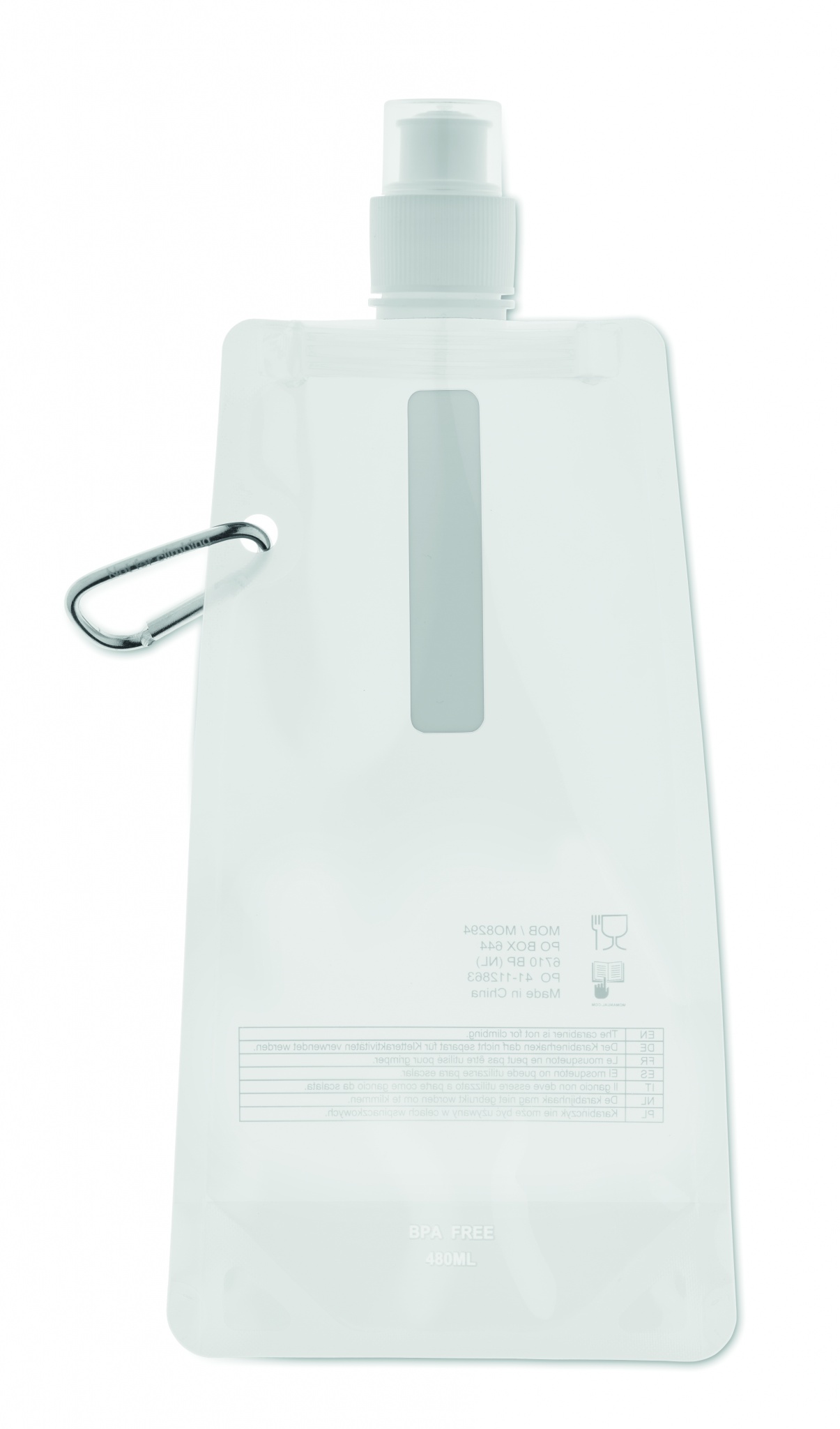 Vattenpåse i BPA fri plast med aluminium karbinhake. Med skruvkork och förslutbar drickpip med lock. Rymmer 480 ml. Läckagefritt.