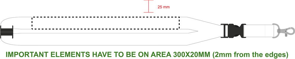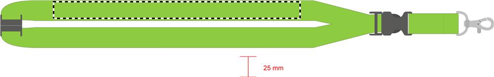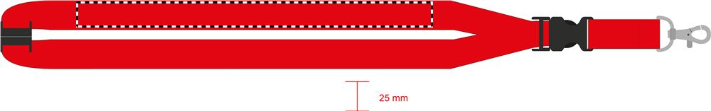 Logoband med metallkrok, avtagbart spänne och säkerhetsspänne i nacken. 25 mm brett. Sublimeringstryck endast på vit produkt.