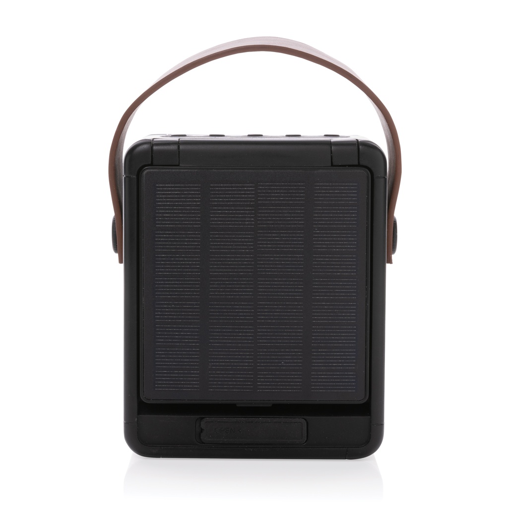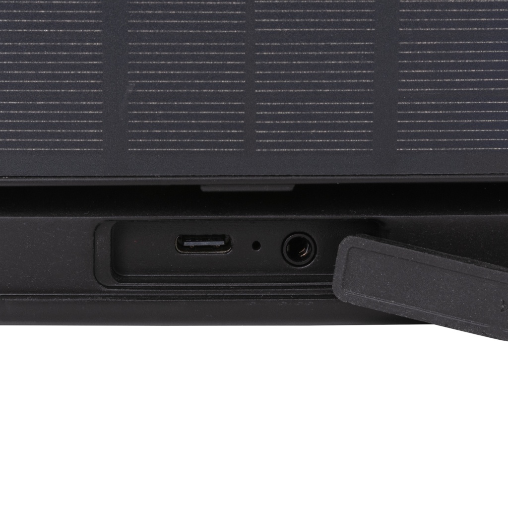 Kraftfull 12W trådlös högtalare med integrerad stor solcellspanel med RCS-certifierad återvunnen ABS. Totalt återvunnet innehåll: 16% baserat på total produktvikt. RCS-certifiering garanterar en helt certifierad leveranskedja för de återvunna materialen. Högtalaren använder monokristallina solcellspaneler av hög kvalitet med 19% omvandlingsgrad. Laddningshastigheten beror på förhållandena. Med integrerad LED-lampa för att använda högtalaren även när solen har gått ner. Högtalaren är utrustad med ett 2.000 mAh-batteri som ger upp till 8 timmars speltid och BT5.3 för smidig anslutning och klart ljud. Räckvidd upp till 10 meter. Med mikrofon och funktion för att besvara samtal. Laddningshastighet solenergi: 5V/300mA. Levereras i FSC mix FSC®-box. Laddningskabel i RCS-certifierad återvunnen TPE-medföljer. Produkt och tillbehör är 100% PVC-fria.